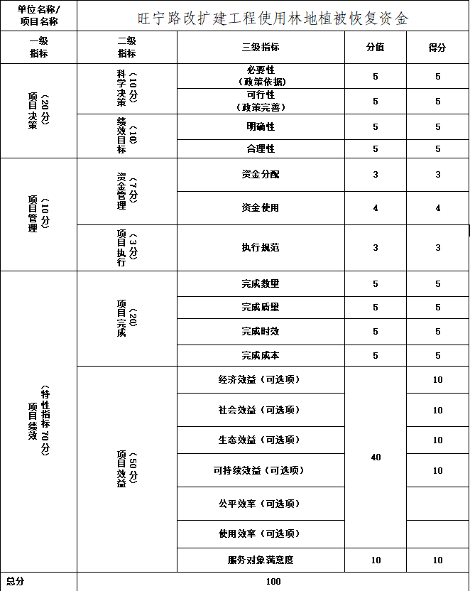 本部门对旺宁路改扩建工程使用林地植被恢复资金开展了绩效评价,自评得分100分。