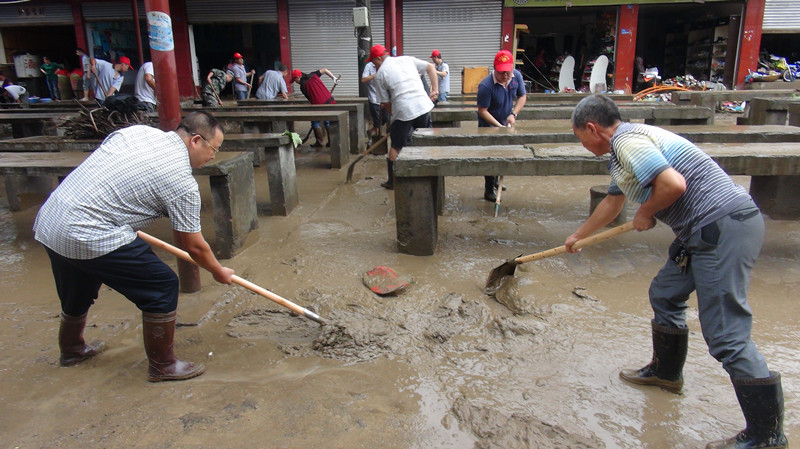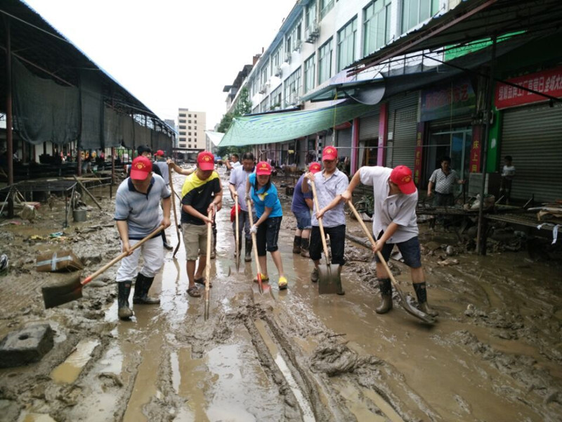 为了使受灾商户尽快恢复经营,降低损失,方便居民出行,29日,洪水刚刚开始消退,三江镇组织机关党支部、个体协会党支部、三江坝社区党支部等党员代表成立了50人的党员突击队来到市场,帮助受灾商户和居民清淤。