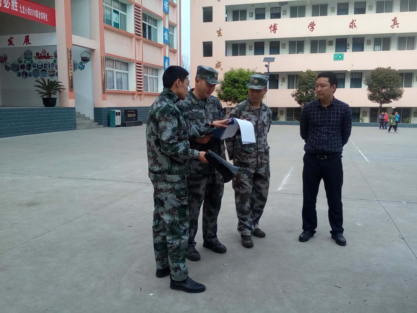 在九龙镇民兵训练基地,徐阳现场点验了镇应急民兵排,了解了民兵训练情况,并对全体民兵的军容军仪给予了高度评价。