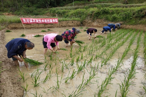 东河镇农技巡回服务队在石坝6社参加张克文家栽秧劳动
