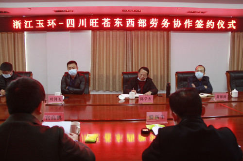 3月8日,在旺苍县人社局会议室,浙江省台州市玉环市与旺苍县举行了劳务协作签约仪式,县委常委、县政府副县长滕新生主持签约仪式,浙江省玉环市人大党组副书记陈学杰、县政府副县长宫高鹏及县人社局党组书记、局长刘雄参加仪式。