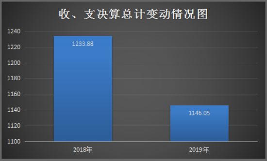 2019年度收、支总计1,146.05万元。与2018年相比,收、支总计各减少87.83万元,下降7.11%。主要变动原因是一次性新会计制度培训费用和压减其他费用等。