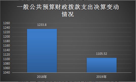 2019年一般公共预算财政拨款支出1,105.52万元,占本年支出合计的100%。与2018年相比,一般公共预算财政拨款减少87.83万元,下降10.4%。主要变动原因是一次性新会计制度培训费用和压减其他费用等。