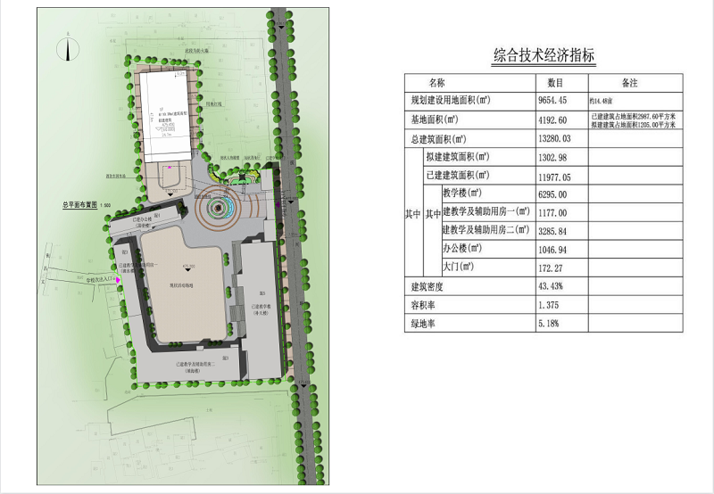 拟建方案总经济技术指标为:建设用地面积9654.45平方米;建筑占地面积4192.6平方米(其中已建建筑占地面积2787.6平方米,新建建筑占地面积1205平方米);总建筑面积13280.03平方米(其中拟建建筑面积1302.98平方米,已建建筑面积11977.05平方米);建筑密度43.43%;容积率1.375;绿地率5.18%。