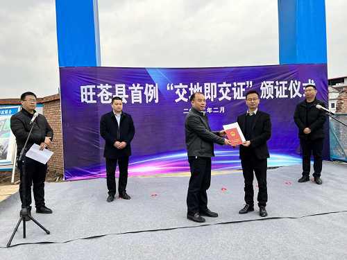 2月24日,旺苍县自然资源局在嘉川镇石龙村避险搬迁安置点项目现场举行了旺苍县首例“交地即交证”颁证仪式。