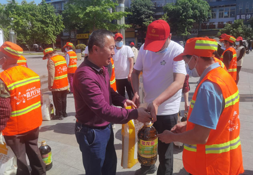 活动现场县文化体育中心携手广元体彩分中心向旺苍县环境卫生事务中心赠送380件反光工作马甲,同时对部分奋战在环卫一线上的工人师傅送上大米和食用油,感谢广大环卫工人师傅们的辛勤劳动。旺苍县环境卫生事务中心工会主席杨晓燕对现场工作人员表示了感谢,她说:“非常感谢旺苍文化体育中心和广元体彩分中心对全体环卫工人的关心和关爱,我们全体环卫干部职工将这份情谊谨记于心,心怀感恩,把对我们的关心化作工作动力,继续发扬新时代环卫工人敢于奉献、吃苦耐劳的环卫精神,当好城市的“美容师”,为加快建设“红色旺苍,中国茶乡”作出积极贡献。”