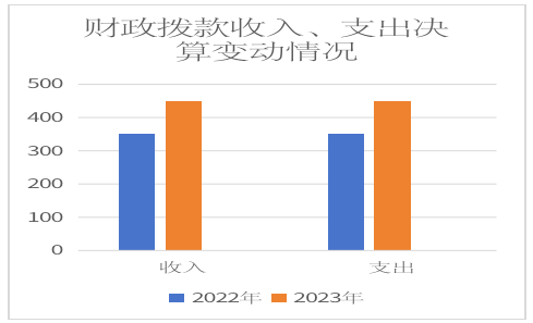 2023年度财政拨款收、支总计均为451.14万元。与2022年度相比,财政拨款收、支总计各增加99.44万元,增长28.27%。主要变动原因是事业单位人员基础绩效、退休人员生活补贴纳入预算。