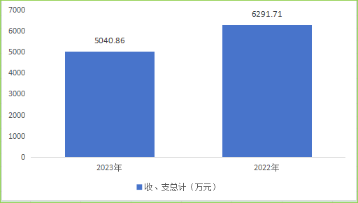 2023年度收、支总计均为5,040.86万元。与2022年度相比,收、支总计各减少1,250.85万元,下降19.88%。主要变动原因是:2023年收、支较2022年收、支减少了专项债券资金(四川省旺苍职业中学产教融合实训培训基地建设项目)2,196.63万元,根本原因在于本级财政资金支付紧张。