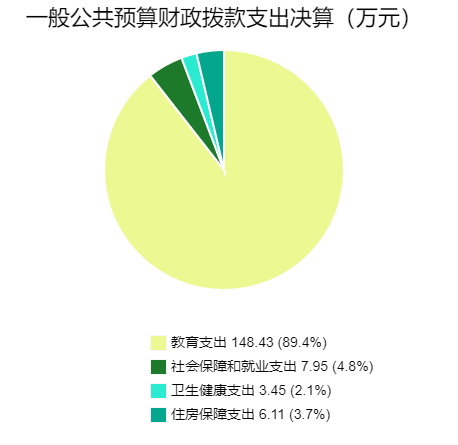 2023年一般公共预算财政拨款支出165.94万元,主要用于以下方面:一般公共服务支出0万元,占0%;教育支出148.43万元,占89.4%;社会保障和就业支出7.95万元,占4.8%;卫生健康支出3.45万元,占2.1%;住房保障支出6.11万元,占3.7%。