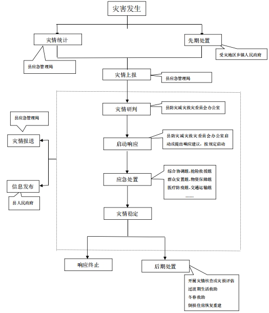 4.1.1 县防灾减灾救灾委员会办公室(县应急管理局)健全工作制度,规范工作流程,严格落实灾情信息报告责任,做到“初报快、续报细、核报准”,确保灾情信息报告及时、准确、全面,坚决杜绝迟报、瞒报、漏报、虚报灾情信息等情况。县应急管理局组织、协调和管理自然灾害情况统计工作,相关涉灾部门按照《自然灾害情况统计调查制度》等要求,及时向县应急管理局提供本部门(行业)的灾情及其他相关数据。
