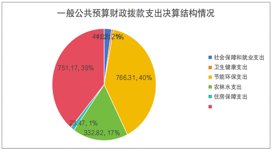 2024年度一般公共预算财政拨款支出1939.32万元,主要用于以下方面: 社会保障和就业支出44.33万元,占2.29%;卫生健康支出11.21万元,占0.58%;节能环保支出766.31万元,占39.51%;农林水支出332.82万元,占17.16%;住房保障支出23.47万元,占1.21%;自然灾害及应急管理支出761.17万元,占39.25%。