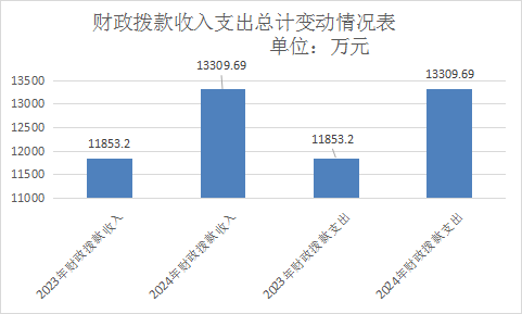 2024年度财政拨款收、支总计均为13309.69万元。与2023年度相比,财政拨款收、支总计各增加1456.49万元,增长12.29%。主要变动原因是人员增加及项目收支增加。
