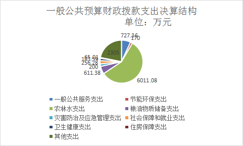 2024年度一般公共预算财政拨款支出10,529.69万元,主要用于以下方面:一般公共服务支出727.36万元,占6.91%;节能环保支出170万元,占1.61%;农林水支出6011.08,占57.09%;粮油物资储备支出611.38万元,占5.81%;灾害防治及应急管理支出200万元,占1.9%;社会保障和就业支出256.28万元,占2.43%;卫生健康支出183.59万元,占1.74%;住房保障支出65.01万元,占0.62%;其他支出2305万元,占21.89%。