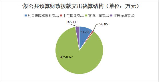 2024年度一般公共预算财政拨款支出5473.43万元,主要用于以下方面:社会保障和就业支出512.8万元,占9.37%;卫生健康支出56.85万元,占1.04%;交通运输支出4758.67万元,占86.94%;住房保障支出145.11万元,占2.65%。