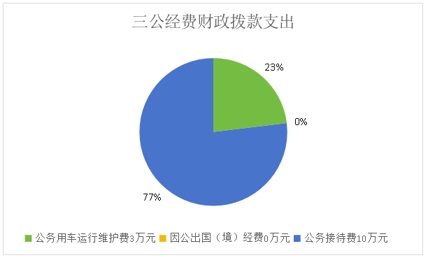 2024年“三公”经费财政拨款支出决算中,因公出国(境)费支出决算0万元,较2023年无变化;公务用车购置及运行维护费支出决算3万元,占23.08%;公务接待费支出决算10万元,占76.92%。具体情况如下: