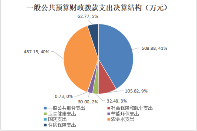 2024年度一般公共预算财政拨款支出1227.83万元,主要用于以下方面:一般公共服务支出508.88万元,占41.44%;国防支出0.73万元,占0.06%;社会保障和就业支出105.82万元,占8.62%;卫生健康支出32.48万元,占2.65%;节能环保支出30.00万元,占2.44%,农林水支出487.15万元,占总支出39.68%,住房保障支出62.77万元,占总支出5.11%。