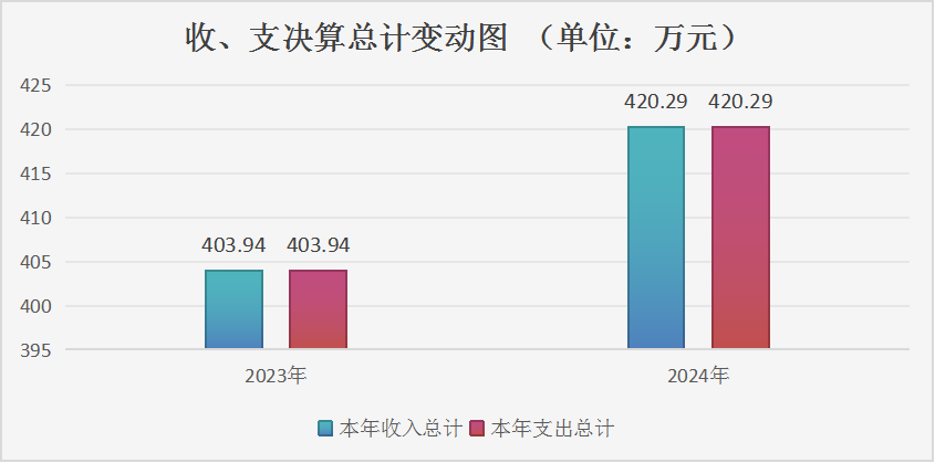 2024年度收、支总计420.29万元。与2023年相比,收、支总计各增加16.35万元,增长4.05%。主要变动原因是新进人员增加,基本增加,收入增加。