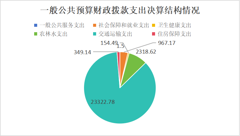2024年度一般公共预算财政拨款支出27113.69万元,主要用于以下方面:一般公共服务支出1.5万元,占0.01%;社会保障和就业支出967.17万元,占3.57%;卫生健康支出154.49万元,占0.57%;农林水支出2318.62万元,占8.55%;交通运输支出23322.78万元,占86.02%;住房保障支出349.14万元,占1.29%。