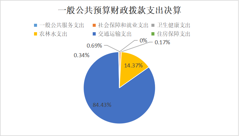 2024年度一般公共预算财政拨款支出16138.42万元,主要用于以下方面:一般公共服务支出1.5万元,占0.01%;社会保障和就业支出110.85万元,占69%;卫生健康支出27.4万元,占0.17%;农林水支出2318.62万元,占14.36%;交通运输支出13625.1万元,占84.43%;住房保障支出54.95万元,占0.34%。