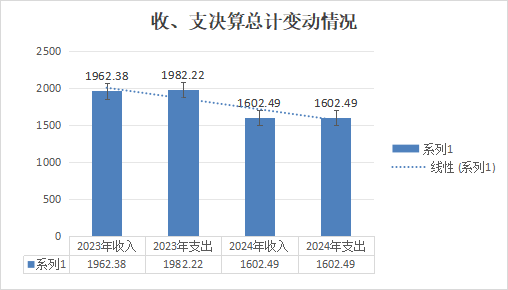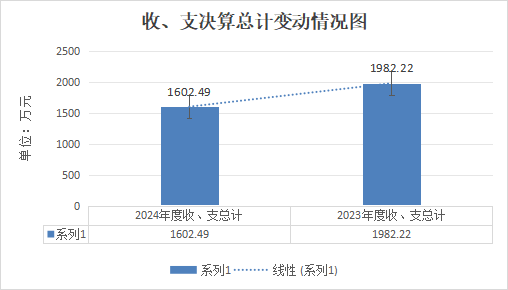2024年度收、支总计均为1602.49万元。与2023年度相比,收、支总计各减少379.73万元,下降19.16%。主要变动原因是中、省项目资金量减少。