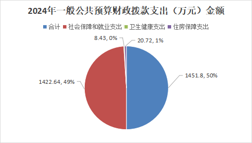 2024年度一般公共预算财政拨款支出1451.8万元,主要用于以下方面:社会保障和就业支出1422.64万元,占97.99%;卫生健康支出8.43万元,占0.58%;住房保障支出20.72万元,占1.43%。