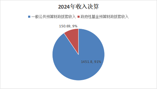 2024年度本年收入合计1602.49万元,其中:一般公共预算财政拨款收入1451.8万元,占90.6%;政府性基金预算财政拨款收入150.69万元,占9.4%;国有资本经营预算财政拨款收入0万元,占0%;上级补助收入0万元,占0%;事业收入0万元,占0%;经营收入0万元,占0%;附属单位上缴收入0万元,占0%;其他收入0万元,占0%。