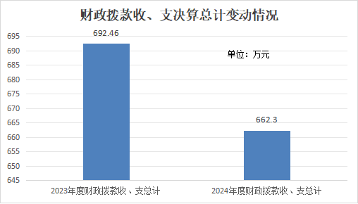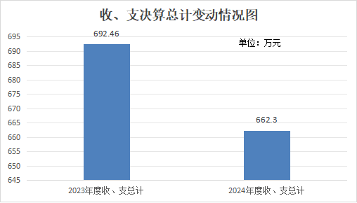 2024年度收、支总计均为662.3万元。与2023年度相比,收、支总计各减少30.16万元,下降4.36%。主要变动原因是行政人员调出导致人员经费、公用经费减少。