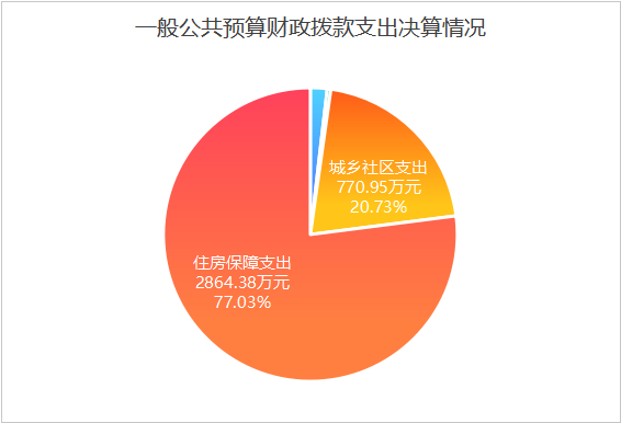 2024年度一般公共预算财政拨款支出3718.45万元,主要用于以下方面:社会保障和就业支出68.36万元,占1.84%;卫生健康支出14.76万元,占0.40%;城乡社区支出770.95万元,占20.73%;住房保障支出2864.38万元,占77.03%。