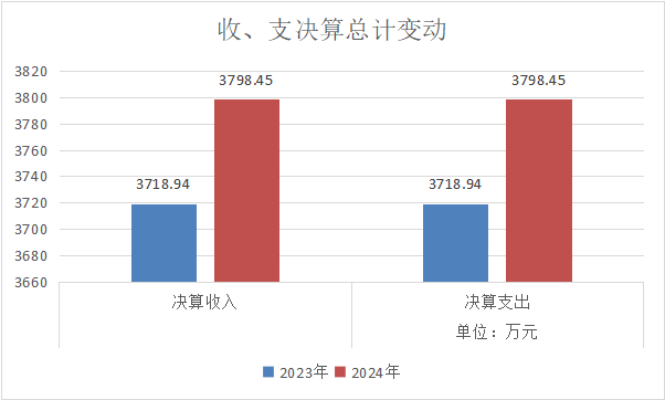 2024年度财政拨款收、支总计均为3798.45万元。与2023年度相比,财政拨款收、支总计均增加79.51万元,增长2.14%。主要变动原因是本年度增加政府性基金预算财政拨款收入。