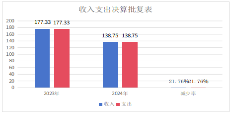 2024年度收、支总计均为138.75万元。与2024年度相比,收、支总计各减少38.58万元,减少21.76%。主要变动原因是人员退休、人员经费减少。