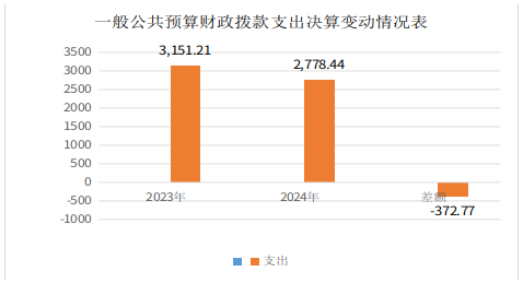 2024年度一般公共预算财政拨款支出2778.44万元,占本年支出合计的30.56%。与2023年度相比,一般公共预算财政拨款支出减少372.77万元,下降11.83%。主要变动原因是2024年中央补助地方公共文化服务体系建设资金相比上年减少。