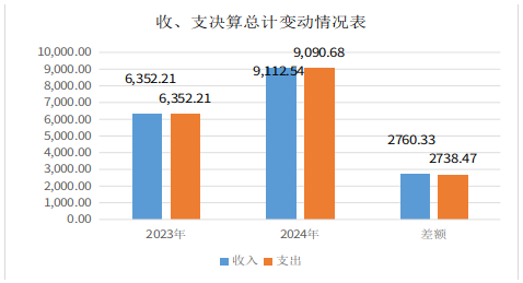 2024年度收入总计9112.54万元,支总计9090.68万元。与2023年度相比,收入增加2760.33万元,增长43.45%,支出增加2738.47万元,增长43.11%。主要变动原因一是本年人员增加,人员经费及公用经费增加,导致收入支出增加,二是专项债券增加,导致收入支出增加。