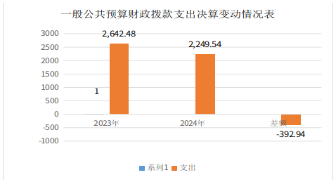 2024年度一般公共预算财政拨款支出2249.54万元,占本年支出合计的26.21%。与2023年度相比,一般公共预算财政拨款支出减少392.94万元,下降14.87%。主要变动原因是2024年中央补助地方公共文化服务体系建设资金相比上年减少。