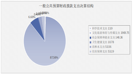 2024年度一般公共预算财政拨款支出2249.54万元,主要用于以下方面:科学技术支出13.9万元,占0.62%;文化旅游体育与传媒支出1969.75万元,占87.56%;社会保障和就业支出148.36万元,占6.6%;卫生健康支出10.78万元,占0.5%;农林水支出53.56万元,占2.38%;住房保障支出53.19万元,占2.36%。