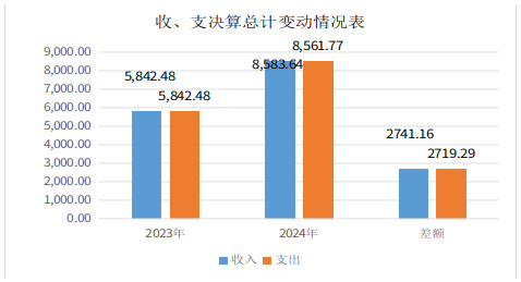 2024年度收入总计8583.64万元,支出总计8561.77万元。与2023年度相比,收入增加2741.16万元,增加46.92%,主要变动原因是新进人员6人,人员工资及公用经费收入增加,专项债券收入增加;支出增加2719.29万元,增长46.54%。主要变动原因是新进人员工资及公用经费支出增加,专项债券支出增加。