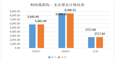 2024年度财政拨款收入总计8560.32万元,支出总计8560.32万元。与2023年度相比,收入增加2717.84万元,增加46.92%,主要变动原因是新进人员6人,人员工资及公用经费收入增加,专项债券收入增加;支出增加2717.84万元,增长46.54%。主要变动原因是新进人员工资及公用经费支出增加,专项债券支出增加。