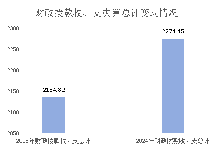 2024年度财政拨款收、支总计均为2274.45万元。与2023年度相比,财政拨款收、支总计各增加139.63万元,增长6.54%。主要变动原因是村级公共服务经费调整,增加国有企业退休人员社会化管理补助支出、其他国有土地使用权出让收入安排的支出。