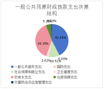 2024年度一般公共预算财政拨款支出2216.67万元,主要用于以下方面:一般公共服务支出940.67万元,占42.44%;国防支出2.00万元,占0.09%;社会保障和就业支出233.03万元,占10.51%;卫生健康支出57.99万元,占2.62%;农林水支出850.21万元,占38.35%;;住房保障支出115.23万元,占5.20%;灾害防治及应急管理支出17.54万元,占0.79%。