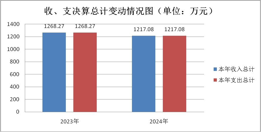 2024年度收、支总计均为1217.08万元。与2023年度相比,收、支总计各减少51.19万元,下降4.04%。主要变动原因是年初预算项目资金减少。