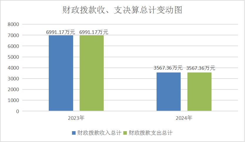 2024年度财政拨款收、支总计均为3567.36万元。与2023年度相比,财政拨款收、支总计各减少3423.81万元,下降48.97%。主要变动原因是本年度机关事业单位职业年金缴费收、支均减少,以及本年度无行政单位离退休支出。