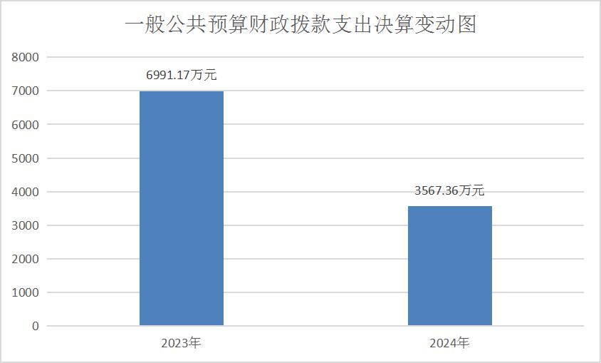 2024年度一般公共预算财政拨款支出3567.36万元,占本年支出合计的100%。与2023年度相比,一般公共预算财政拨款支出减少3423.81万元,下降48.97%。主要变动原因是本年度机关事业单位职业年金缴费收、支均减少,以及本年度无行政单位离退休支出。