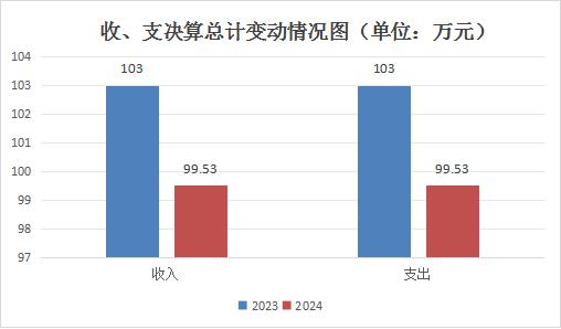 2024年度收、支总计均为99.53万元。与2023年度相比,收、支总计各减少3.47万元,下降3.37%。主要变动原因是人员类经费减少。