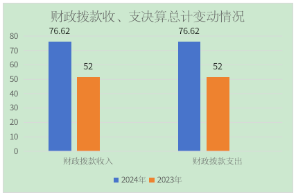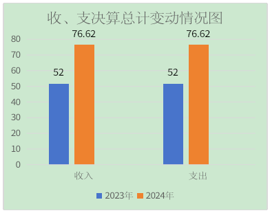 2024年度收、支总计均为76.62万元。与2023年度相比,收、支总计各增加24.62万元,增加47.35%。主要变动原因是公务员基础绩效由本单位发放。
