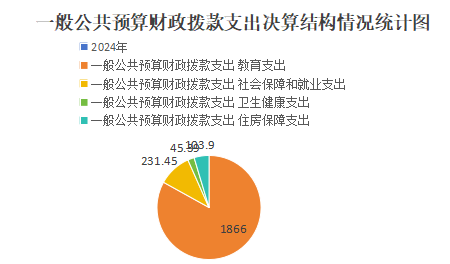 2024年一般公共预算财政拨款支出2253.73万元,主要用于以下方面:教育支出1866万元,占82.79%;社会保障和就业支出231.45万元,占10.26%;卫生健康支出45.39万元,占2.01%;住房保障支出103.89万元,占4.6%。