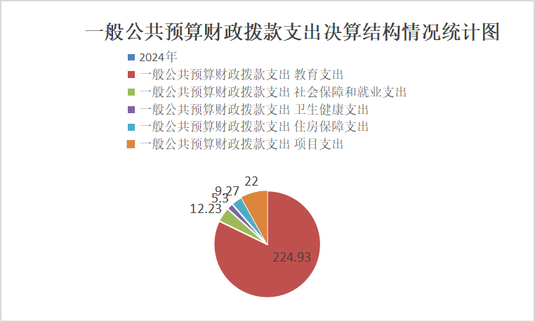 2024年度一般公共预算财政拨款支出273.74万元,主要用于以下方面:教育支出246.93万元,占90.21%;社会保障和就业支出12.23万元,占4.47%;卫生健康支出5.3万元,占1.94%;住房保障支出9.27万元,占3,39%;项目支出22万元,占8.03%。