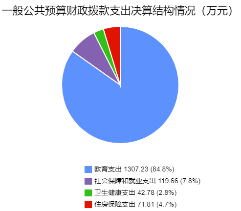 2024年一般公共预算财政拨款支出1541.48万元,主要用于以下方面:教育支出1307.23万元,占84.80%;社会保障和就业支出119.66万元,占7.76%;卫生健康支出42.78万元,占2.78%;住房保障支出71.81万元,占4.66%。