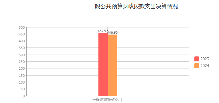 2024年一般公共预算财政拨款支出446.95万元,占本年支出合计的100%。与2023年相比,一般公共预算财政拨款支出减少了6.18万元,下降了1.34%%。主要变动原因是人员减少、薄改设备购置等费用。