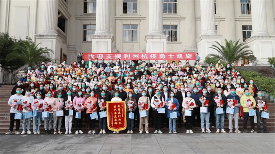 欢迎仪式上,唐文辉、杜非等县领导向抗疫人员送上了鲜花和礼品,并集体合影留念。