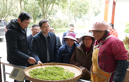 在五权镇,郭金桥一行先后来到山花村虹越矿业、五权镇铜钱村,分别调研了省级环保督察典型案例整改情况和特色茶产业发展及春茶产销情况。他强调,要进一步提高政治站位,牢固树立“生态优先、绿色发展”理念,把环保督察问题整改作为补短板的重要抓手,持续推动问题整改走深走实,严格落实企业主体责任、部门监管责任,进一步完善监管手段,形成齐抓共管的工作格局,切实加强矿山全过程监管,坚决杜绝安全事故发生。茶产业是五权镇的特色产业,要充分发挥资源优势,进一步延伸产业链条,深化“茶产业 文旅”融合发展模式,走小众精品路线,通过电商平台拓宽销路,带动农民增收,为乡村振兴注入新动能。