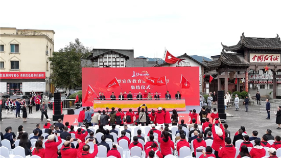 集结仪式上,市委宣传部副部长、市委外宣办(市政府新闻办)主任庞子峻介绍了“高质量发展看广元”主题采访活动。广元市文旅推荐官周欣发布了广元红色旅游精品线路和红色研学精品线路,由近100名媒体记者、专家学者、青少年学生、文艺工作者和志愿者代表组成的5支队伍现场聆听了红色党课《永不磨灭的红色信仰》,观看了情景表演唱《家谱》、歌伴舞表演《旺苍等你来》等文艺节目。